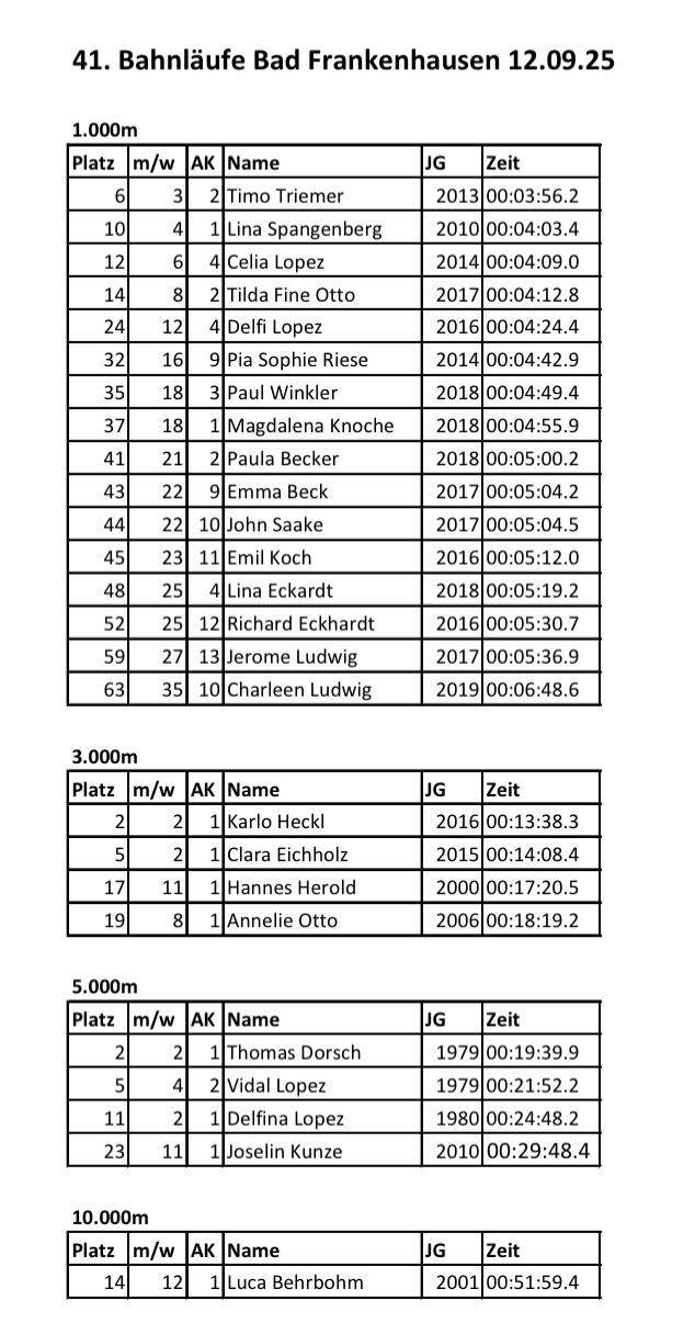 Am Freitag waren wir mit einer starken Mannschaft von 25 Teilnehmerinnen und Teilnehmern bei den Bahnläufen in Bad Frankenhausen am Start. Auf allen vier Strecken waren wir vertreten – vom großen Starterfeld über 1.000 Meter, bis hin zu den 3.000 Meter, 5.000 Meter und sogar den 10.000 Meter. Besonders hervorzuheben ist die Leistung von Karlo Heckl, der über die 3.000 Meter ein großartiges Rennen lief und sich den zweiten Platz in der Gesamtwertung sichern konnte.