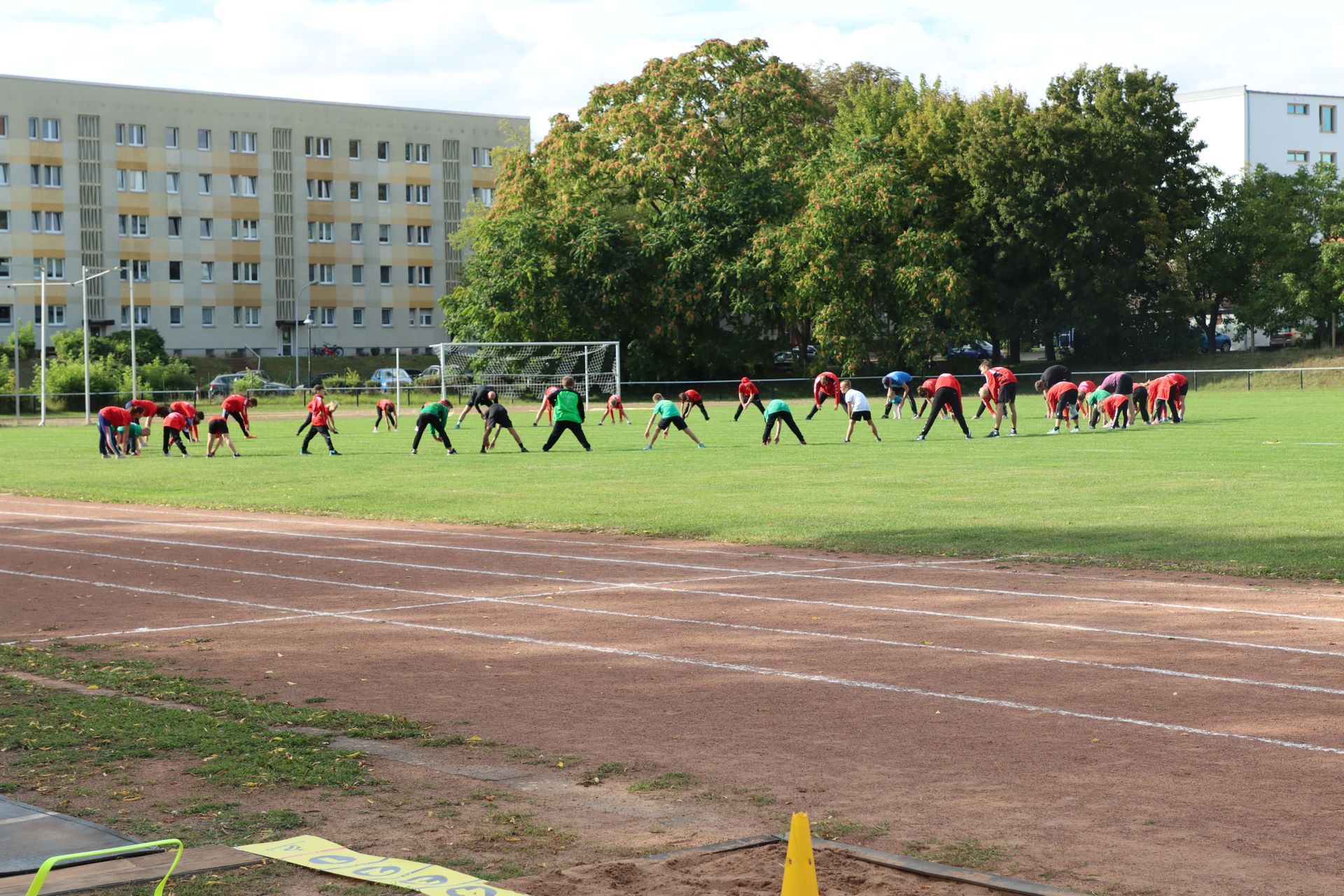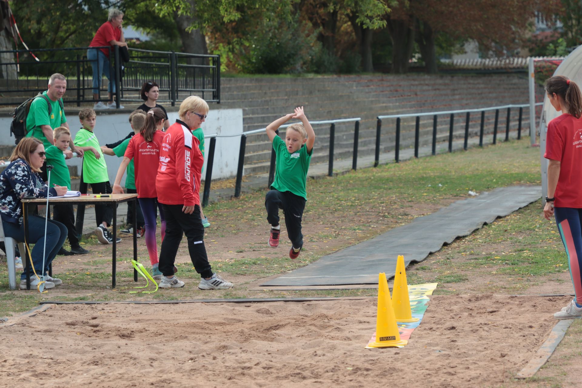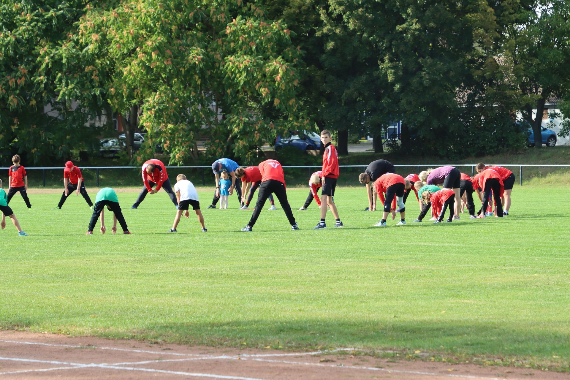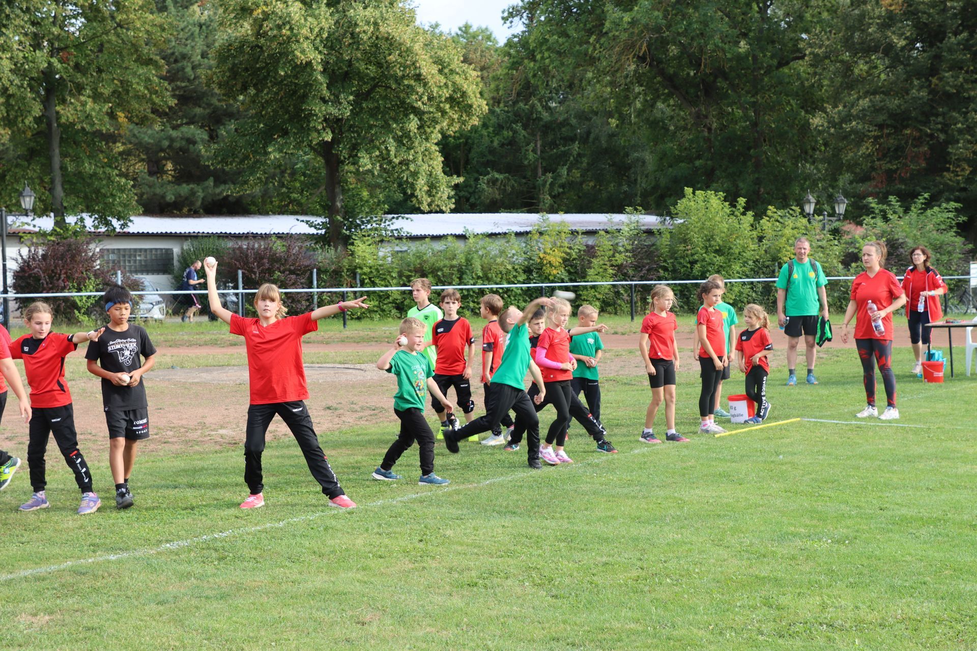 Am Nachmittag folgte im Stadion die nächste sportliche Aktion: Zum Ablegen des Deutschen Sportabzeichens fanden sich 35 Kinder und 9 Erwachsene ein. Damit war die Anlage nach langer Zeit wieder mit Leben gefüllt – in den Disziplinen Laufen (30m-, 50m-, 100m-Sprint, 800m und 3.000m), Springen (Weitsprung und Standweitsprung) und Werfen (Schlagball, Kugelstoßen) herrschte reger Betrieb.