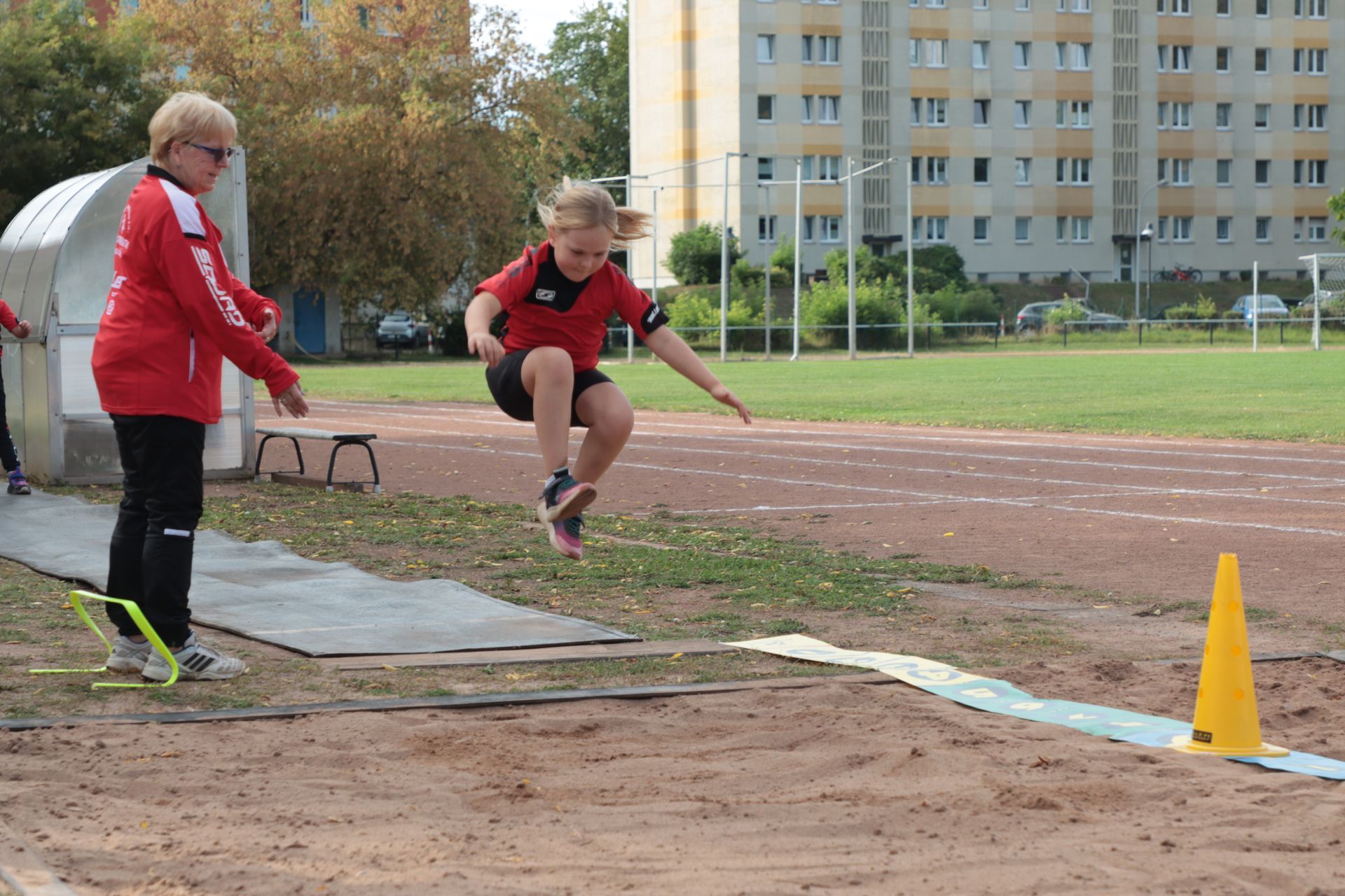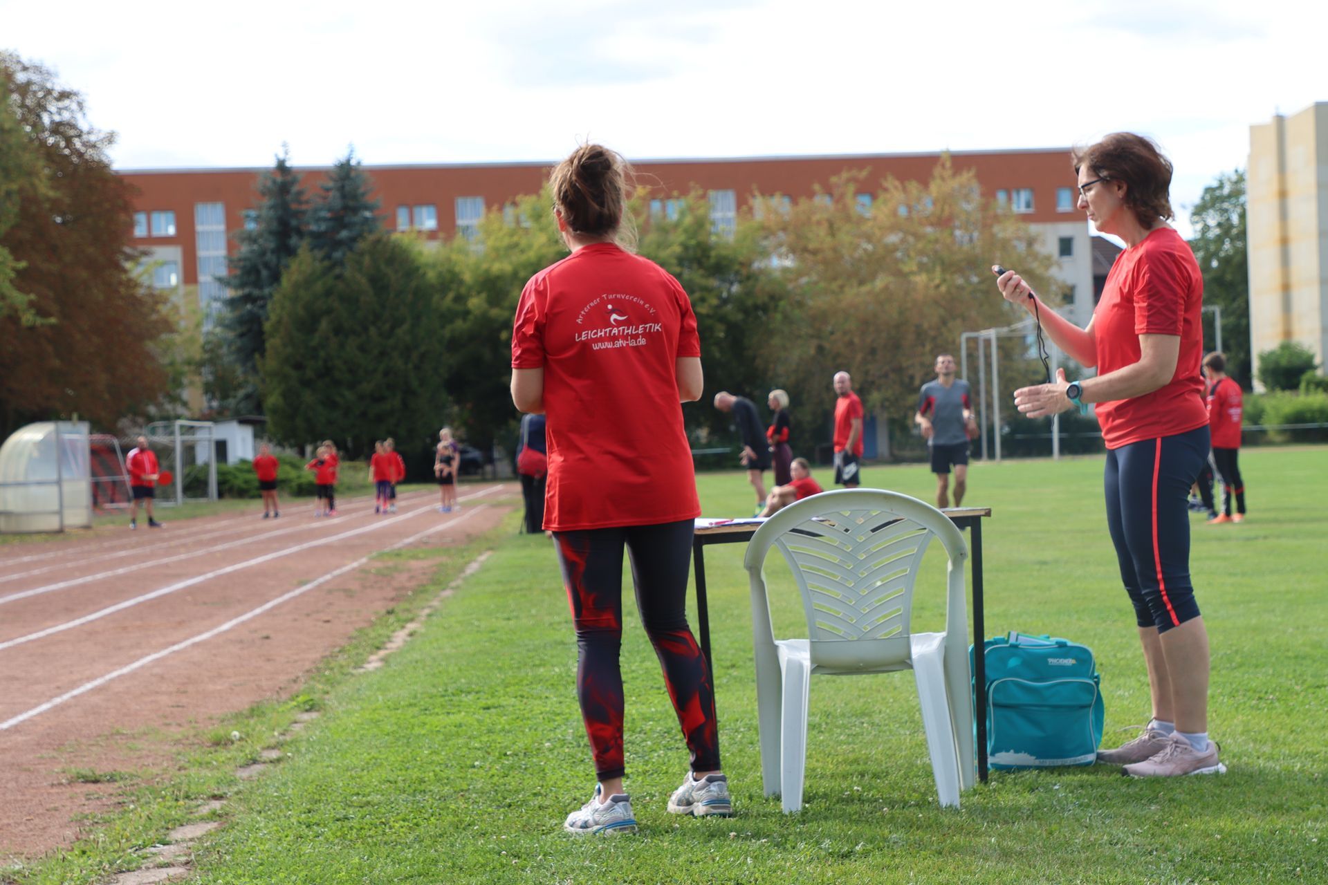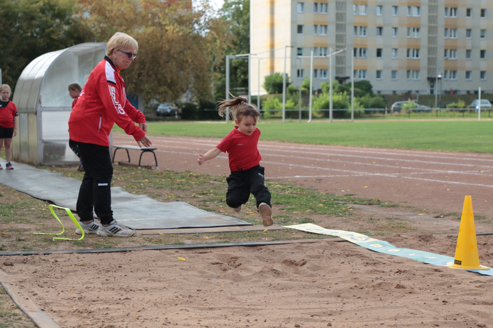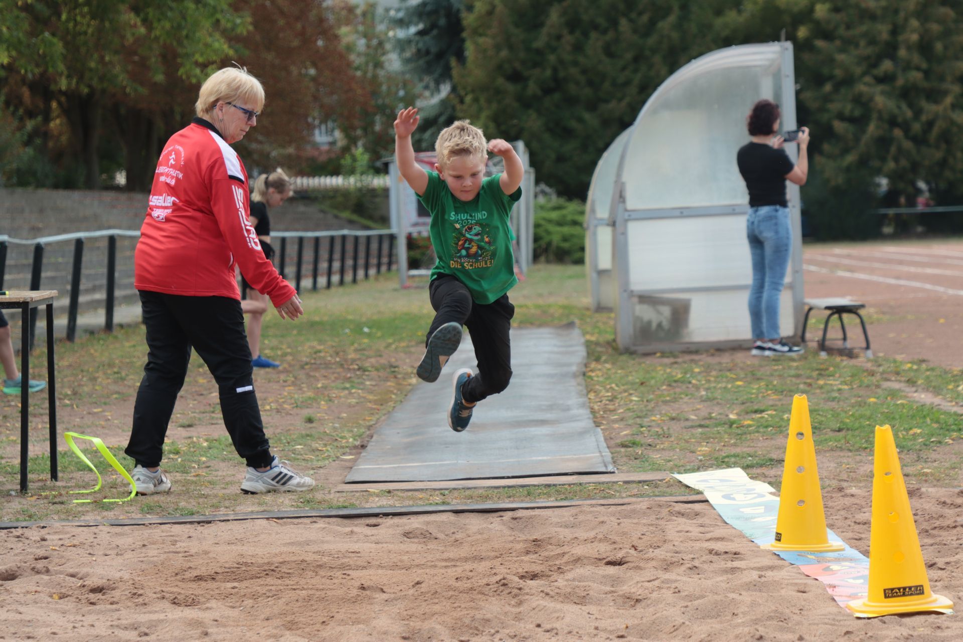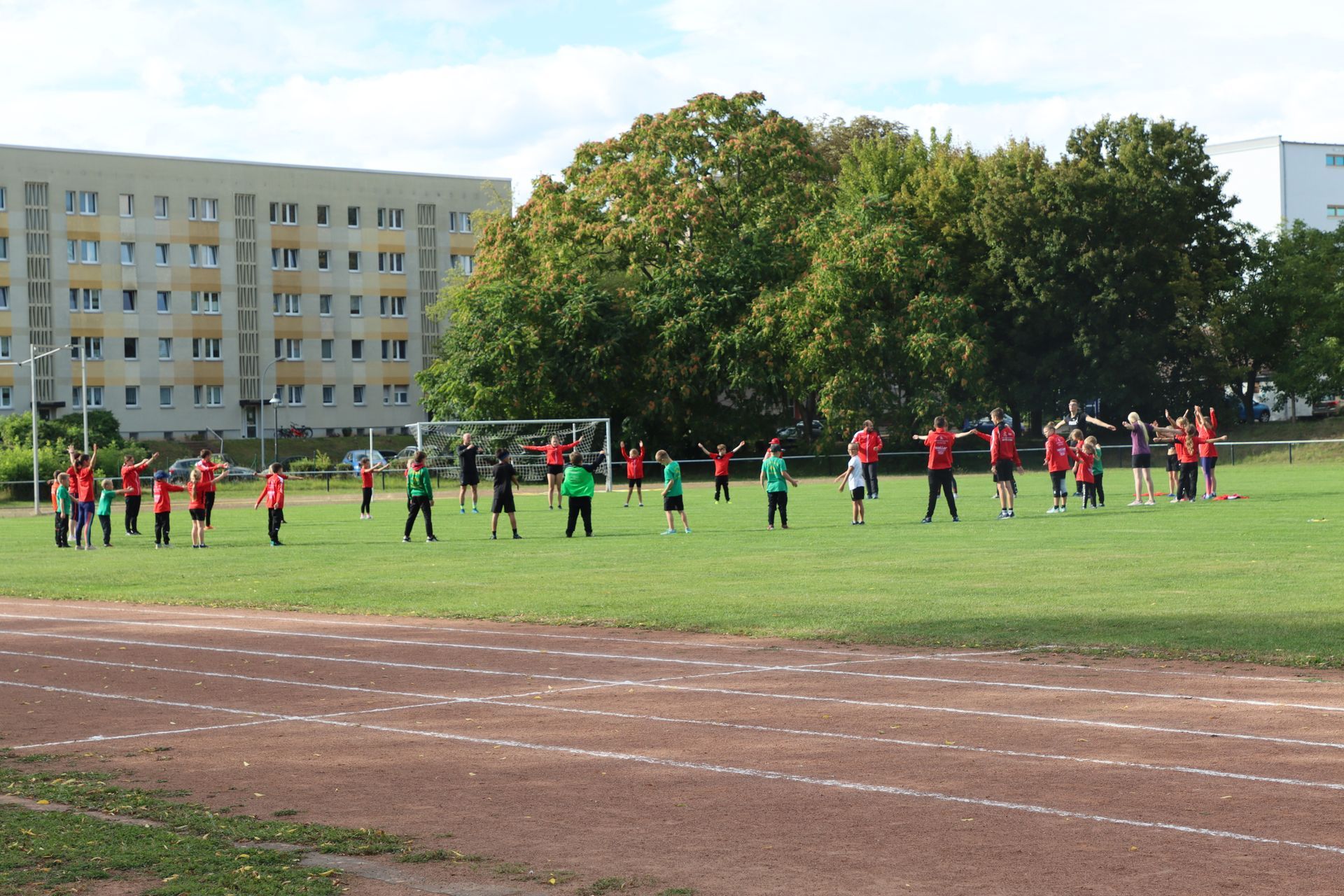 Am Nachmittag folgte im Stadion die nächste sportliche Aktion: Zum Ablegen des Deutschen Sportabzeichens fanden sich 35 Kinder und 9 Erwachsene ein. Damit war die Anlage nach langer Zeit wieder mit Leben gefüllt – in den Disziplinen Laufen (30m-, 50m-, 100m-Sprint, 800m und 3.000m), Springen (Weitsprung und Standweitsprung) und Werfen (Schlagball, Kugelstoßen) herrschte reger Betrieb.