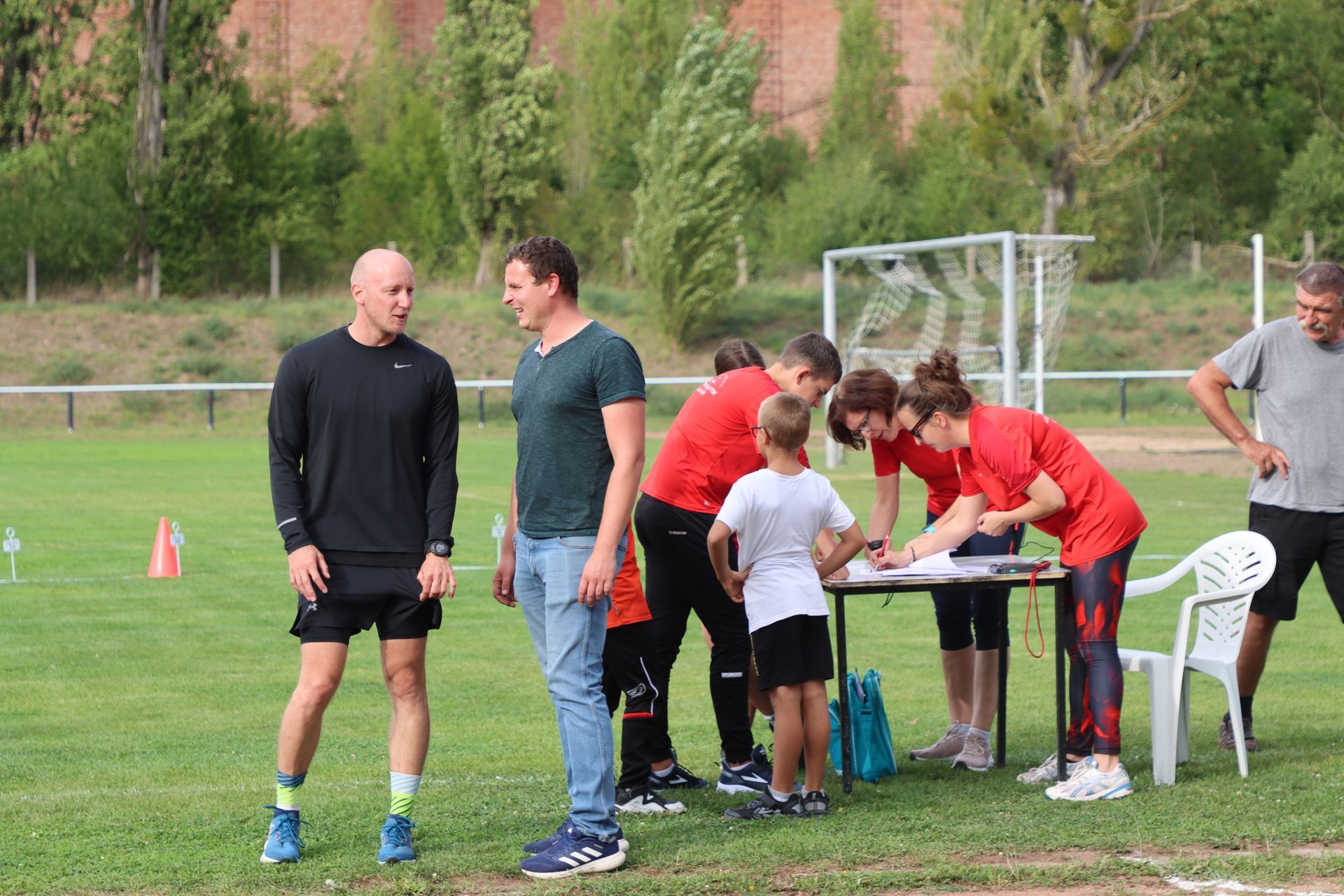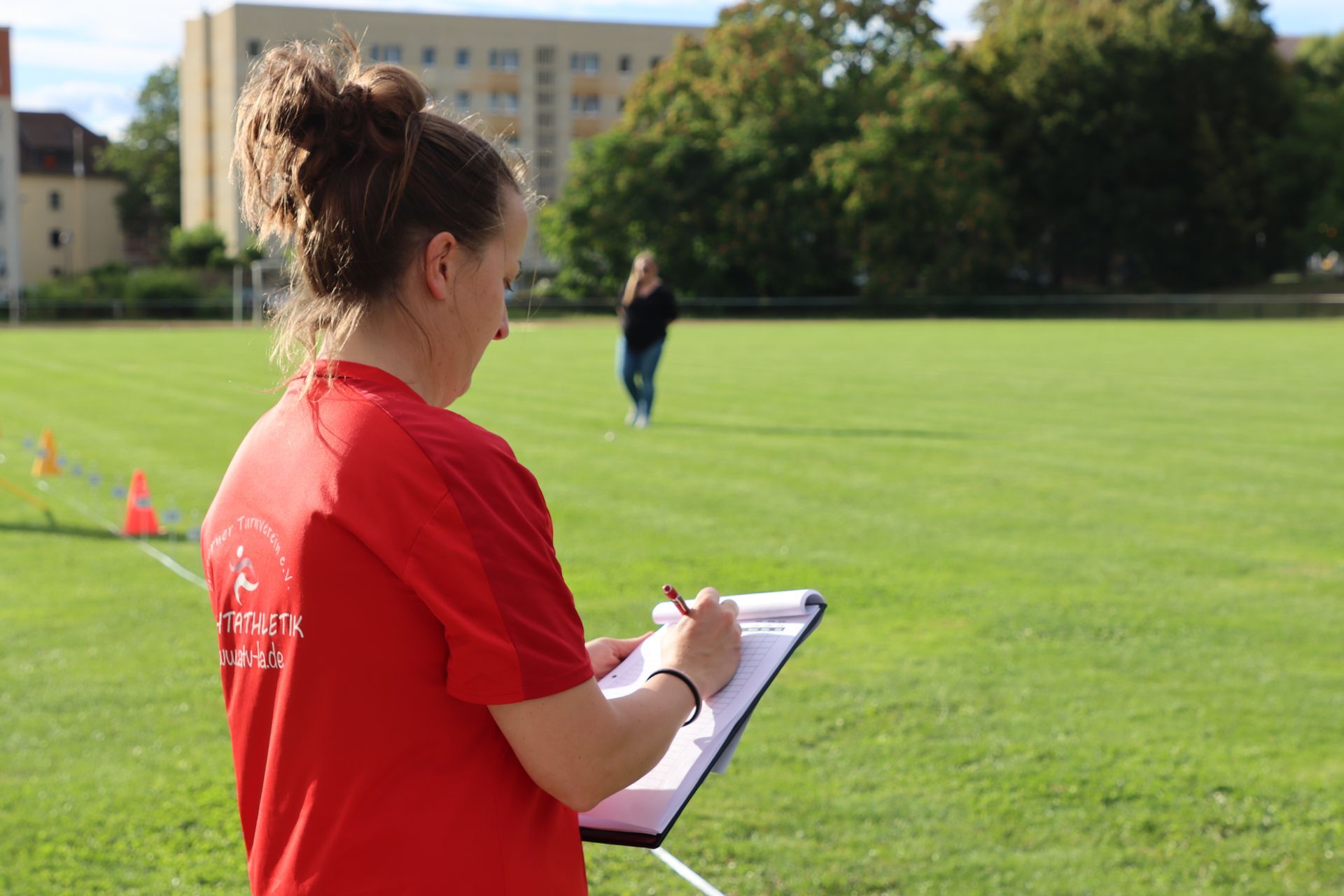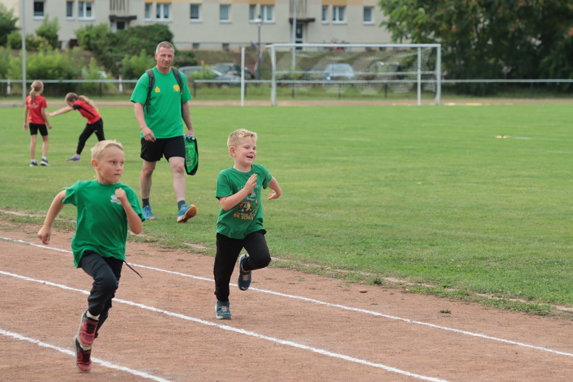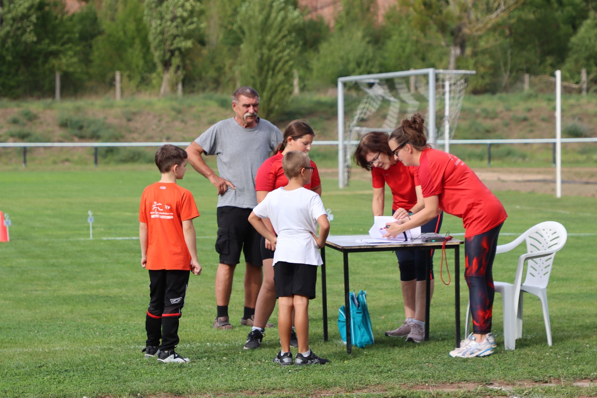 Am Nachmittag folgte im Stadion die nächste sportliche Aktion: Zum Ablegen des Deutschen Sportabzeichens fanden sich 35 Kinder und 9 Erwachsene ein. Damit war die Anlage nach langer Zeit wieder mit Leben gefüllt – in den Disziplinen Laufen (30m-, 50m-, 100m-Sprint, 800m und 3.000m), Springen (Weitsprung und Standweitsprung) und Werfen (Schlagball, Kugelstoßen) herrschte reger Betrieb.
